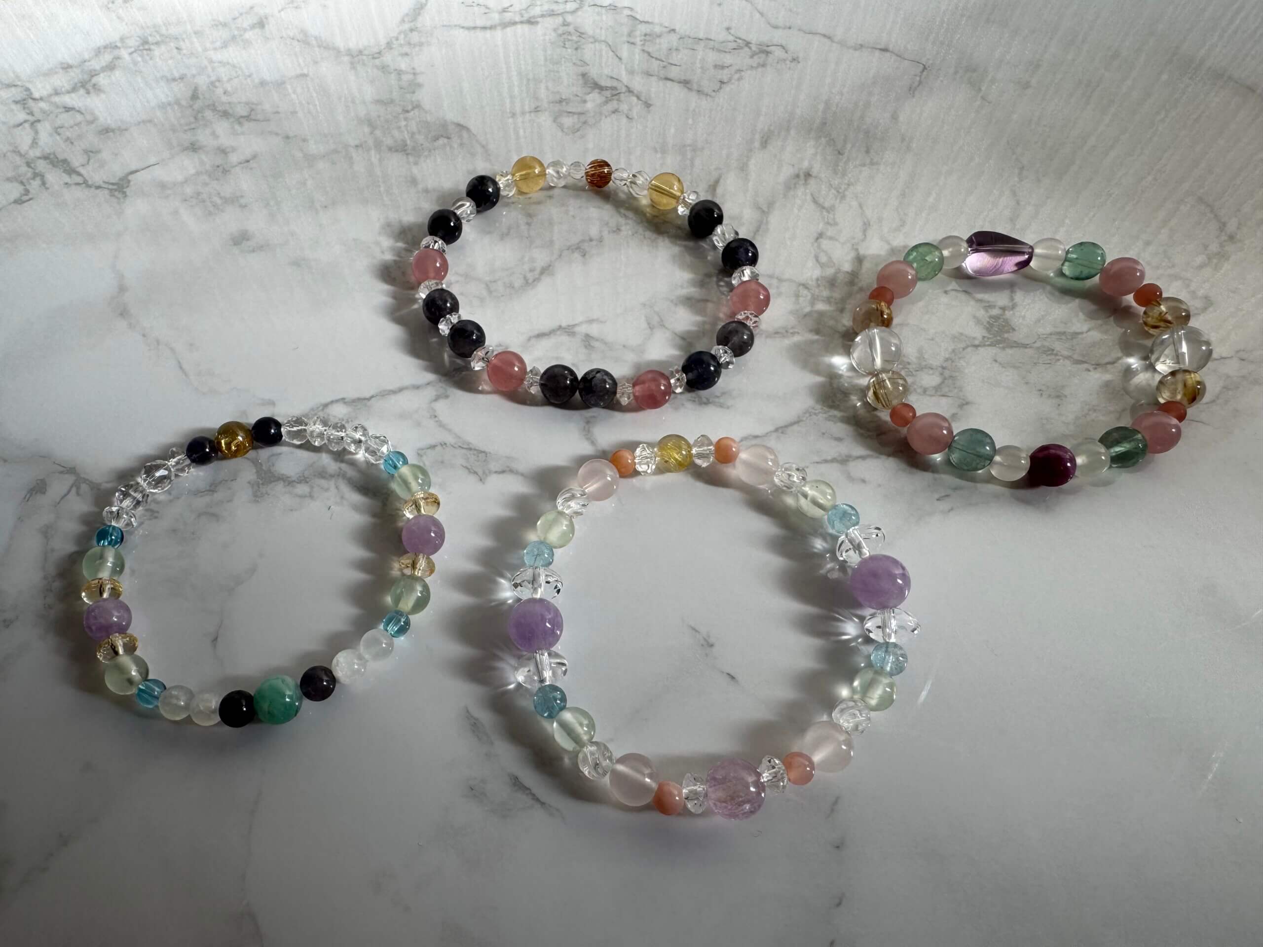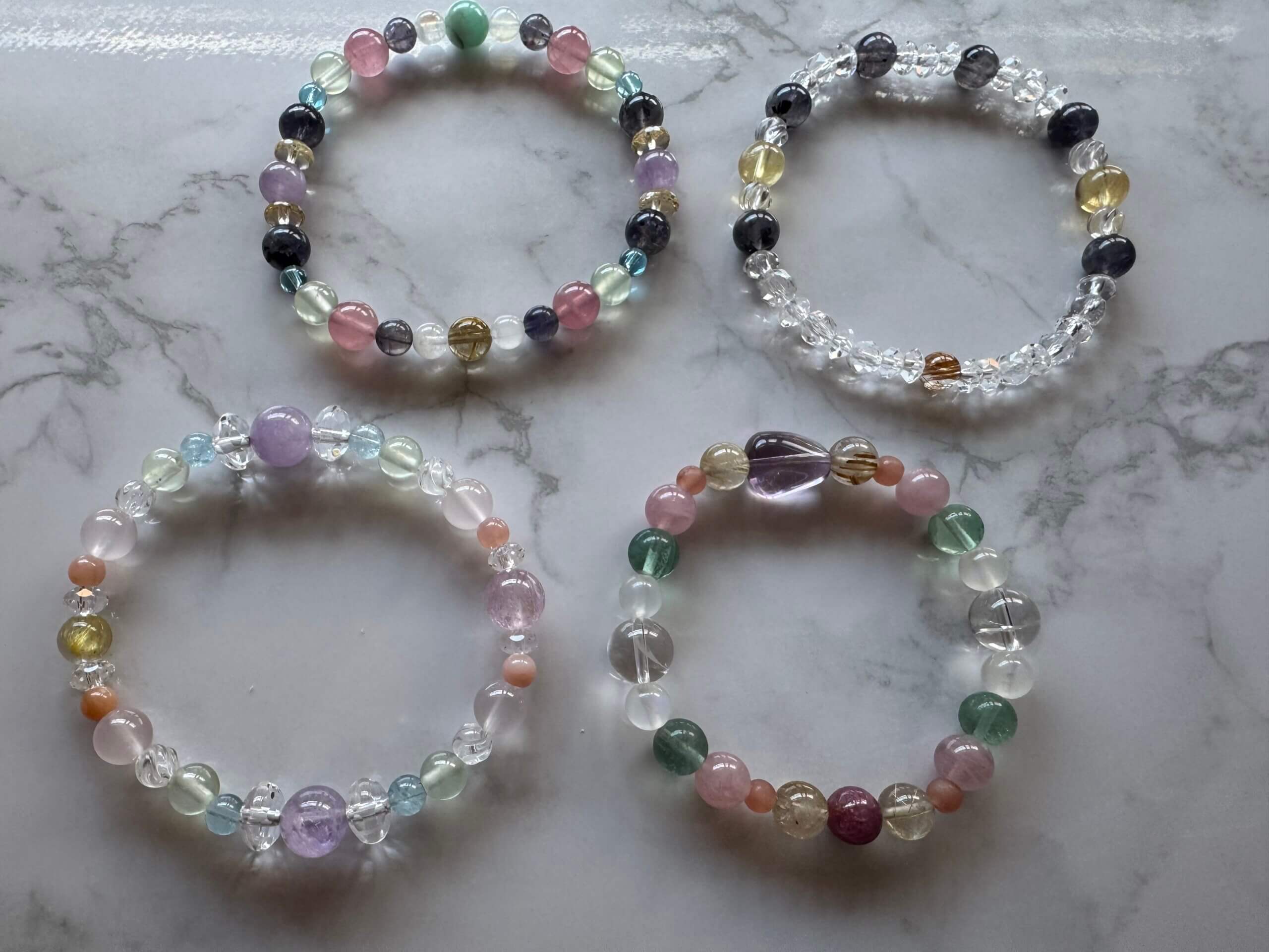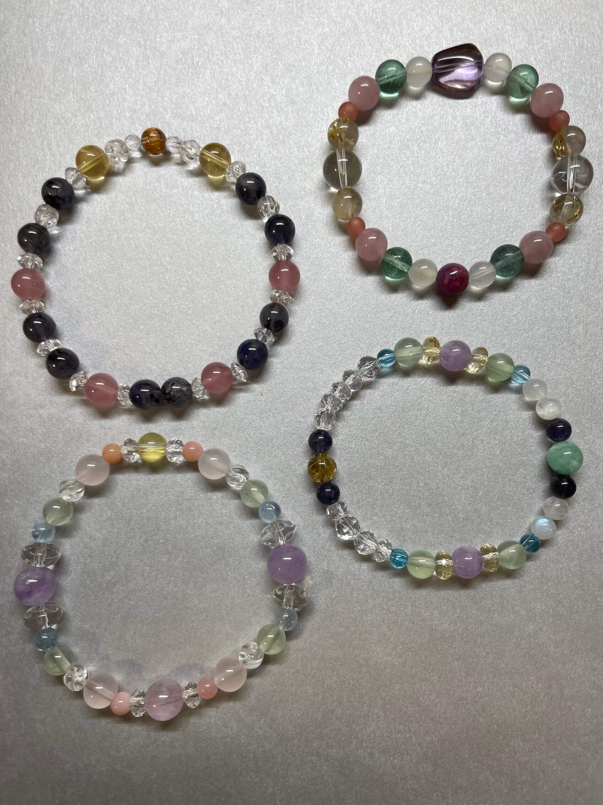 以前はブレスレットのエネルギーのバランスが個々に個性があって、それぞれに強く可愛いけれどまとまりにくかったけれど、今は3枚目の写真右上がとても柔らかくて、左下は中和もできる均衡が取れていて、右下は優しく、左上は力をくれるようなエネルギーを感じています。